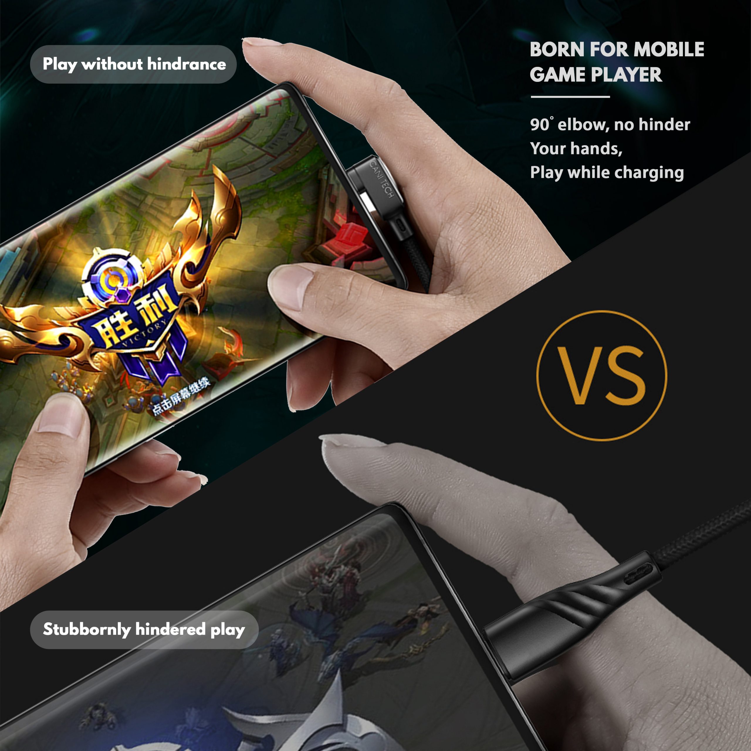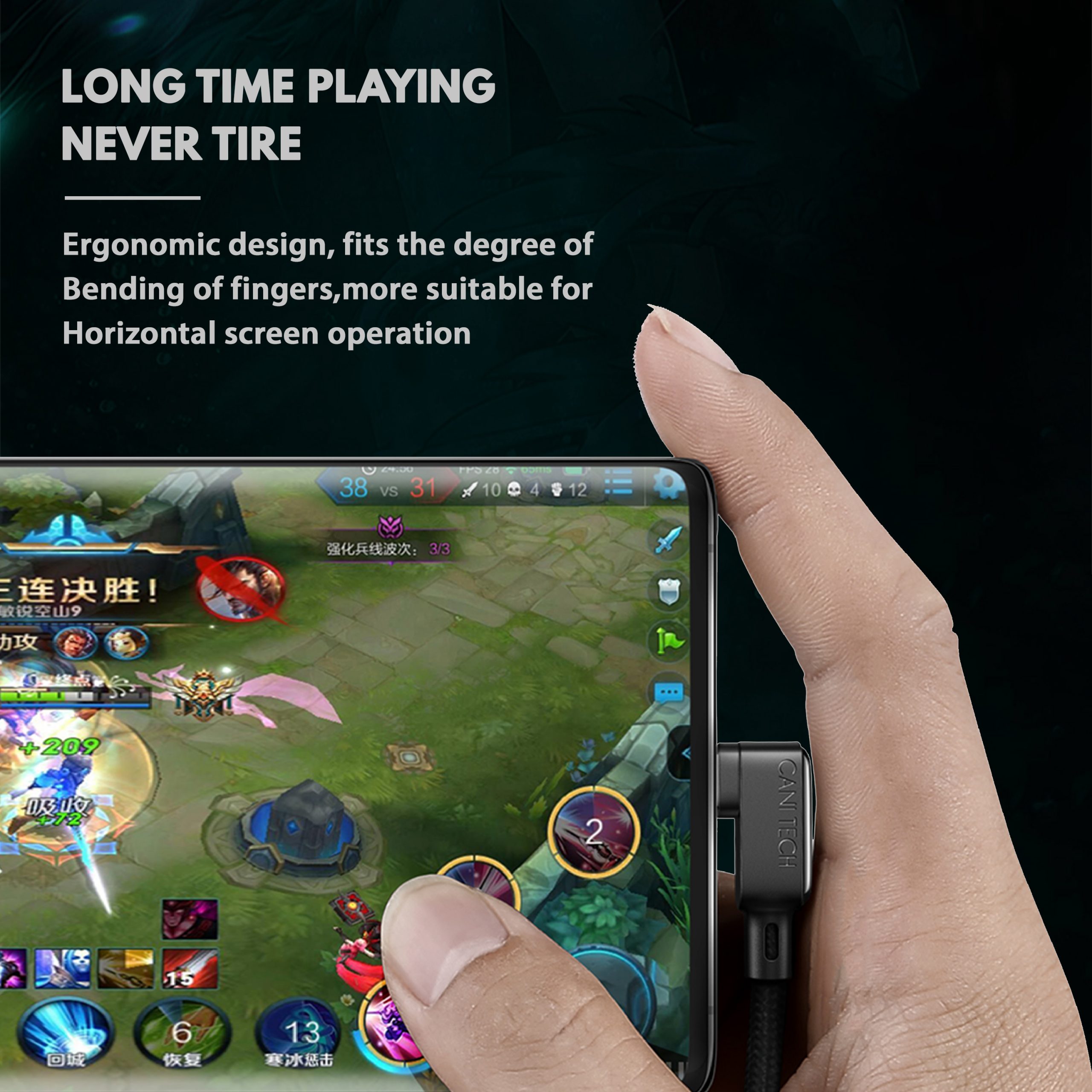 90 Degree Elbow, no hinder your hands play while charging with Mobile fast USB cable. Ergonomic design fits the degree of bending of fingers, more suitable for horizontal screen operation.